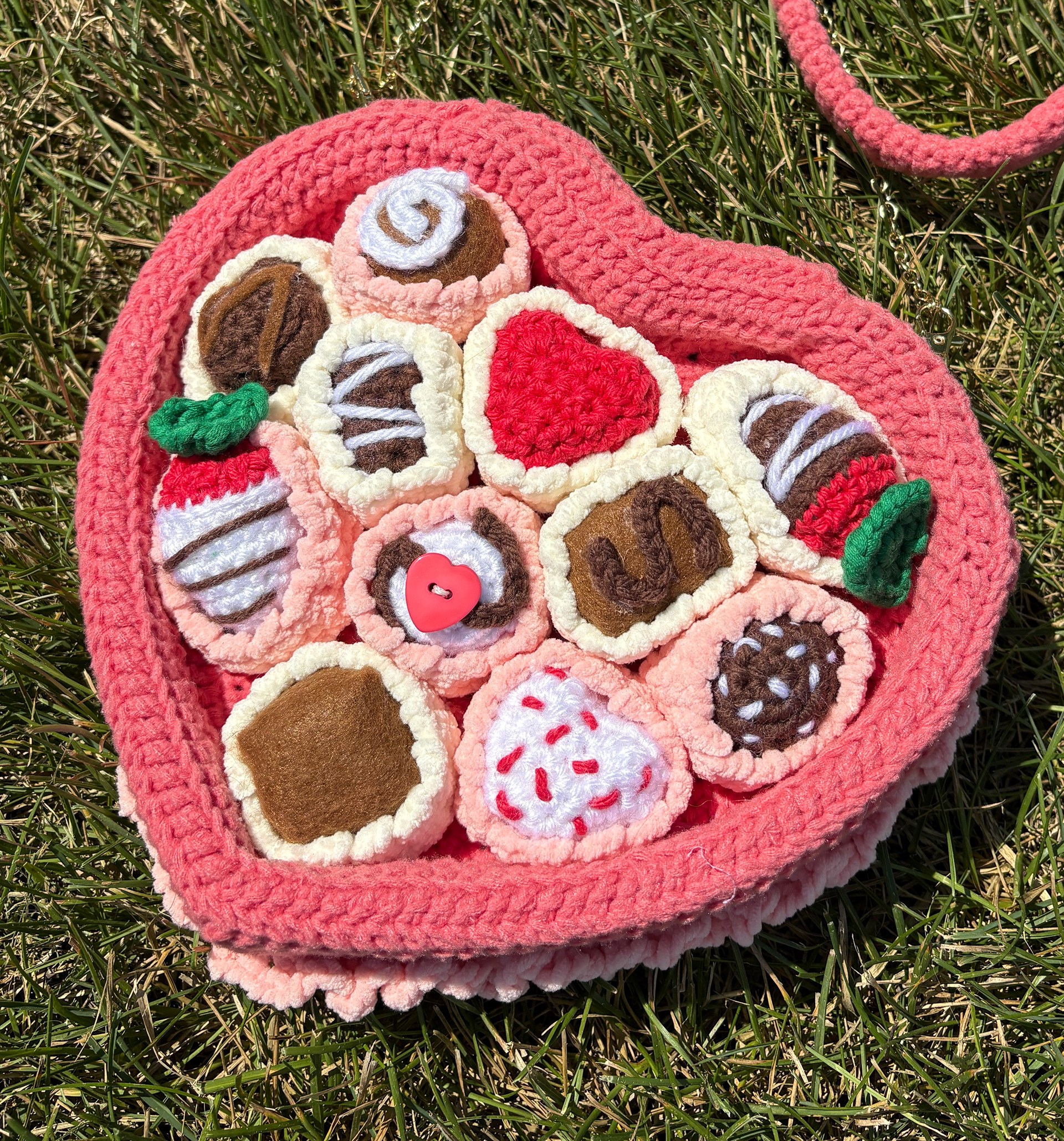 This crochet project involved creating a working purse that looks like a classic Valentine's Day chocolate box.